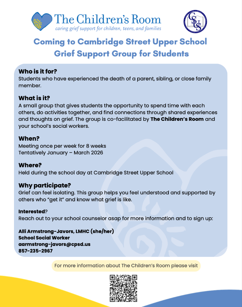 Has your child experienced the loss of a parent, sibling, or close family member? Would you like to get some extra support for them? This winter Alli will be co-facilitating a small group at CSUS with a specialist from The Children's Room to offer some extra connection and support. See attached flyer and contact Ms. Armstrong-Javors with any questions.